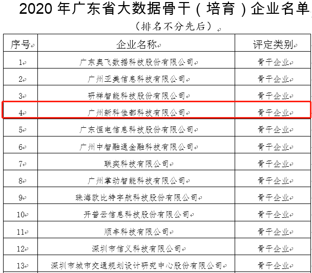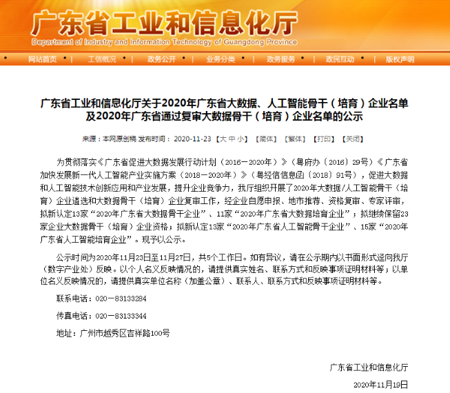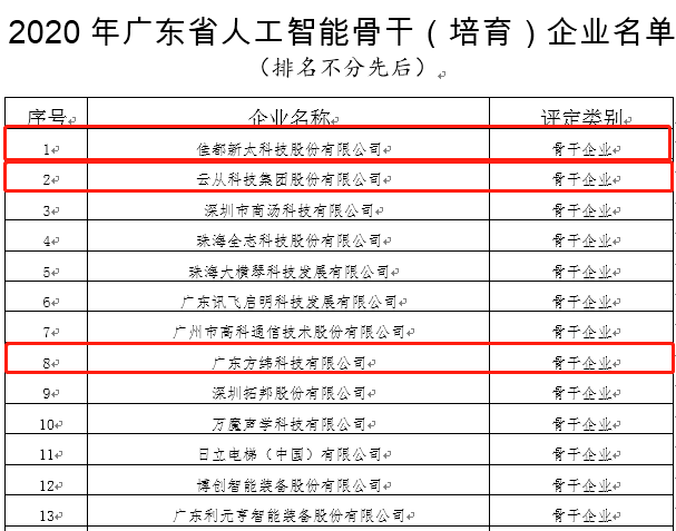 11月23日,广东省工业和信息化厅发布了关于2020年广东省大数据、人工智能骨干(培育)企业名单的公示。jiuyou九游ninegame科技凭借着突出的人工智能创新能力和产业带动作用,入选2020年广东省人工智能骨干企业名单,同时,jiuyou九游ninegame科技控股子公司方纬科技、参股公司云从科技入选该名单,jiuyou九游ninegame科技全资子公司新科佳都入选2020年广东省大数据骨干企业名单。